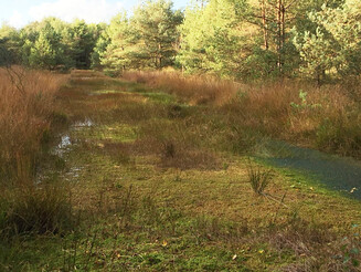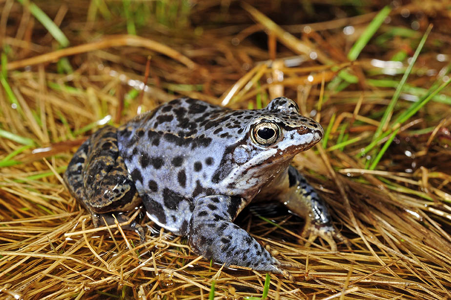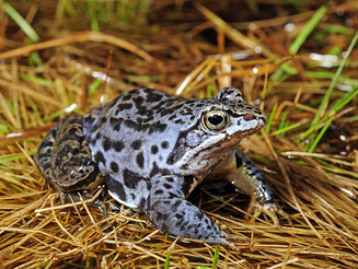 Der Moorfrosch ist die säureresistenteste Froschart und kann am Übergang von Nieder- zu Hochmoor in Gräben, wassergefüllten Handtorfstichen und Kleingewässern siedeln. Die Männchen sind blaugefärbt.