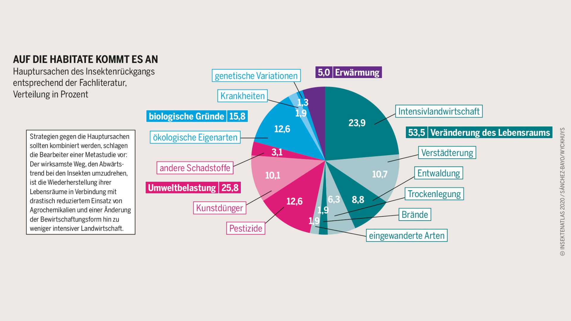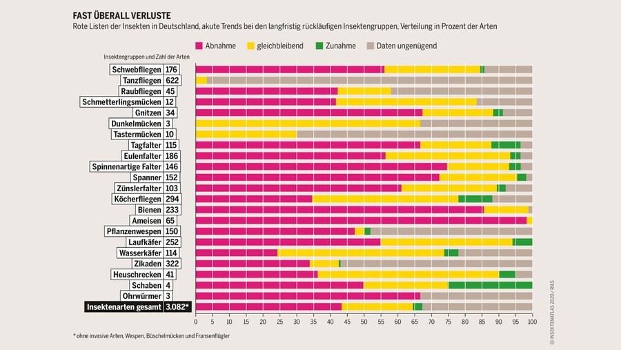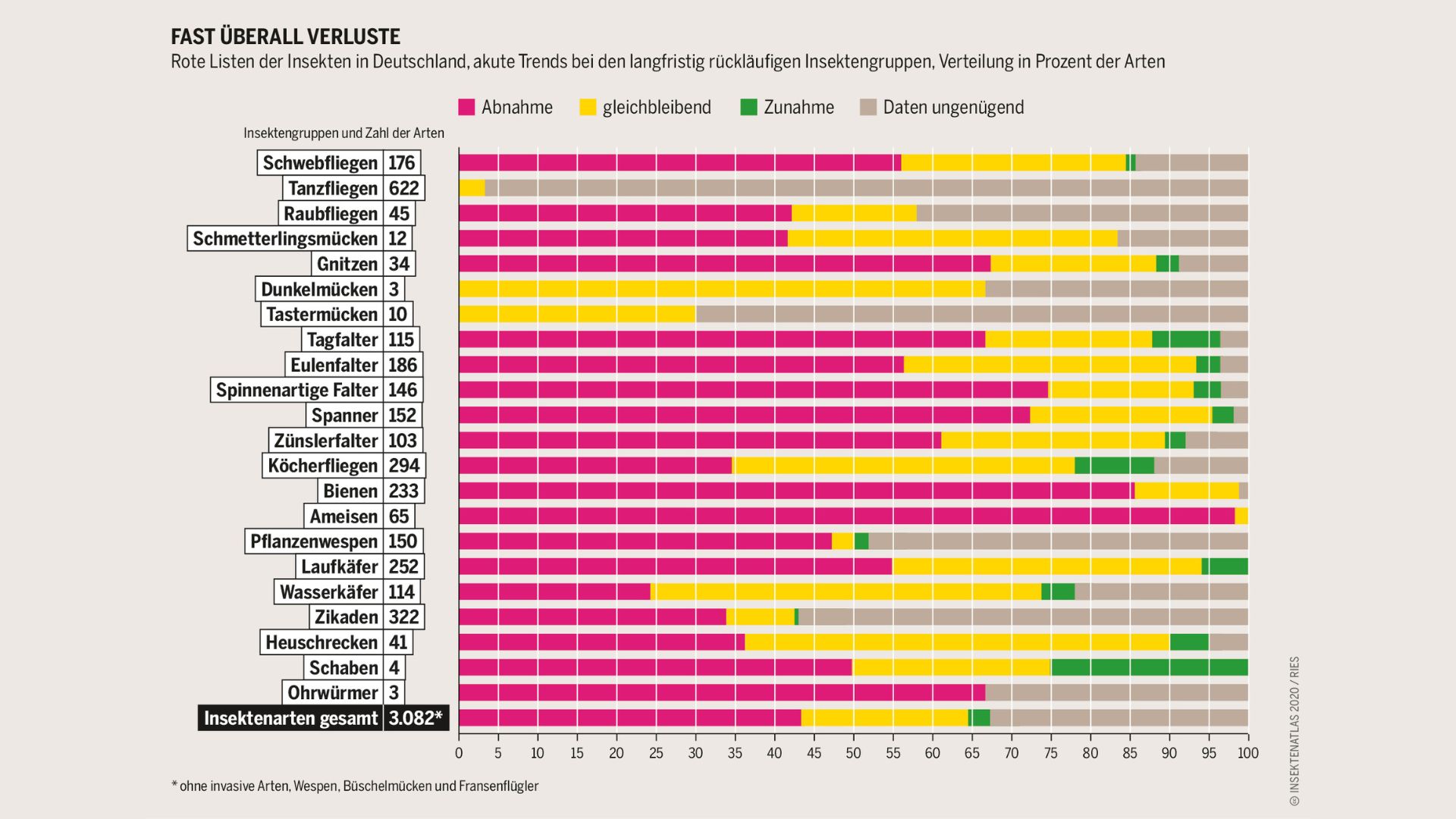 Bei den Schmetterlingen beispielsweise sind besonders die Spezialisten, wie Tagfalter, deren Larven auf bestimmte Futterpflanzen angewiesen sind, gefährdet. Langzeiterfassungen in mehreren Regionen Deutschlands zeigen dauerhafte Verluste von über 70 Prozent der Schmetterlingsarten. Unter den Wildbienen verzeichnen knapp die Hälfte der 561 Arten Rückgänge. Neben dem Verlust der Habitate könnte die Verbreitung von Neonicotinoiden, einer Gruppe von Insektiziden, laut Insektenatlas 2020 zu diesem starken Rückgang beigetragen haben.