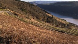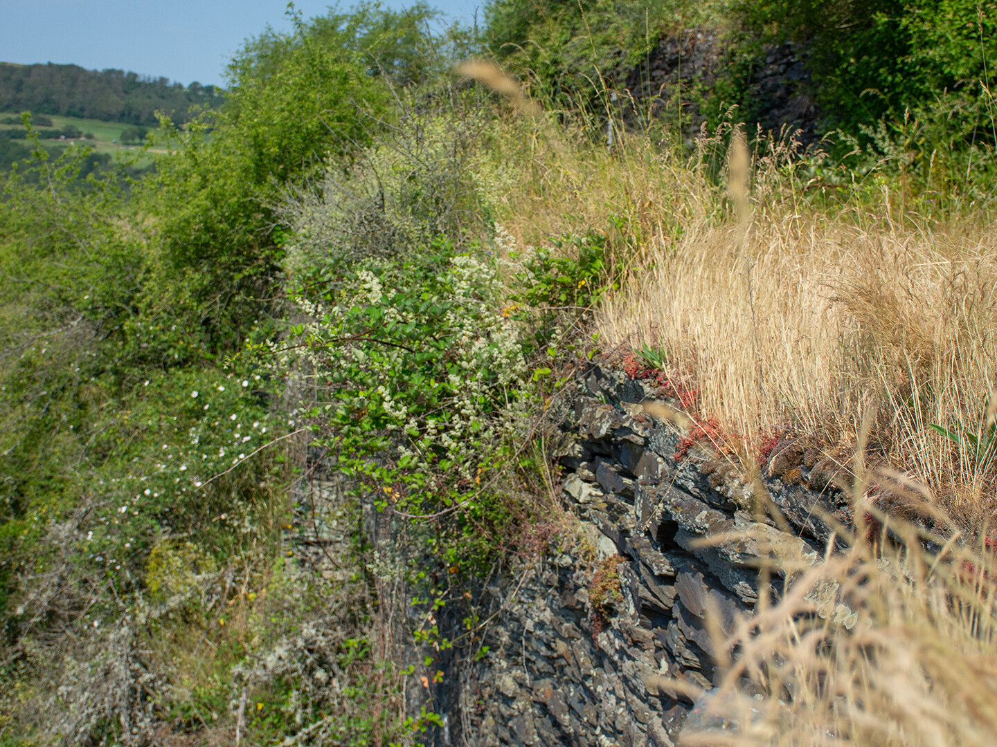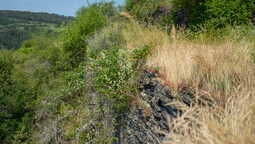 Schieferhalde und noch verbuschter Stollen im Mittelrheintal in Kaub