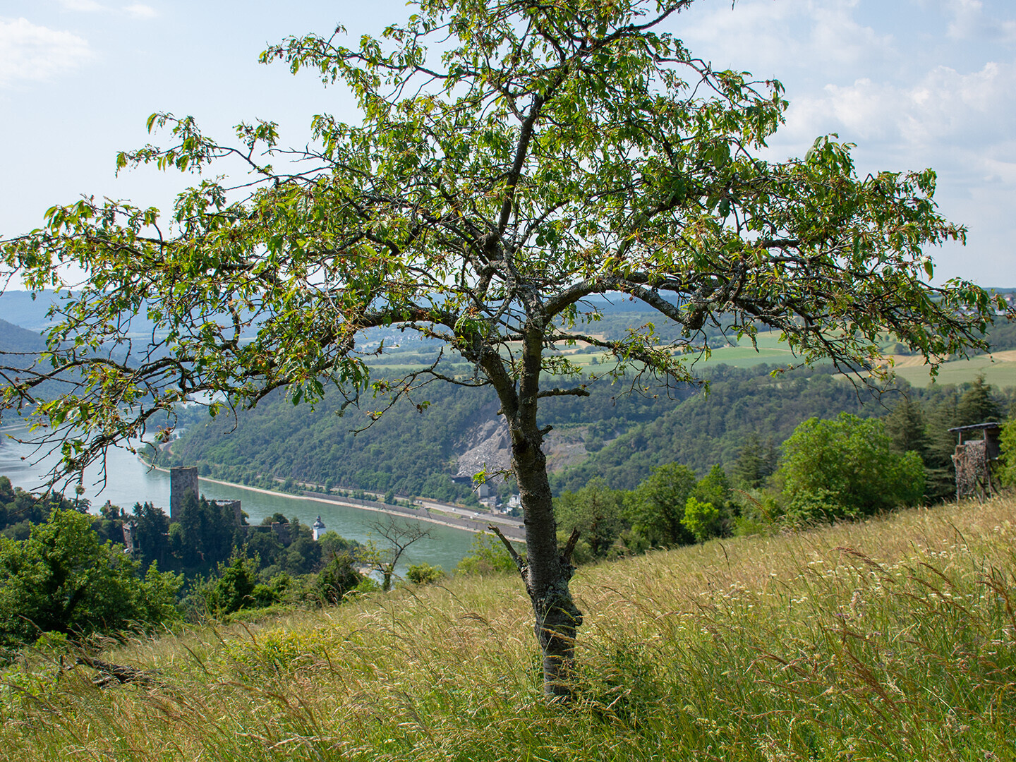 Wiese im Gebiet der Dörscheider Heide vor dem Panorama des Mittelrheins