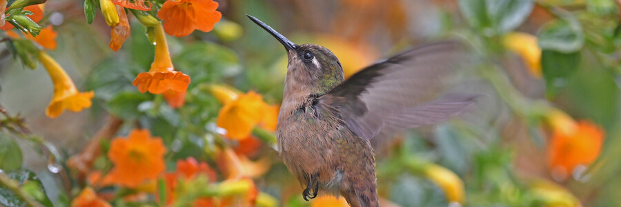Blassstirnkolibri in Kolumbien setzt an zur Nahrungsaufnahme aus orangenen kelchförmigen Blüten