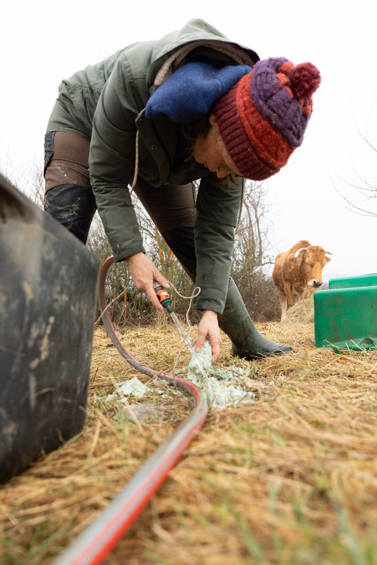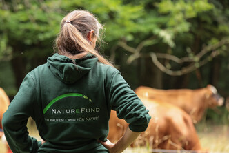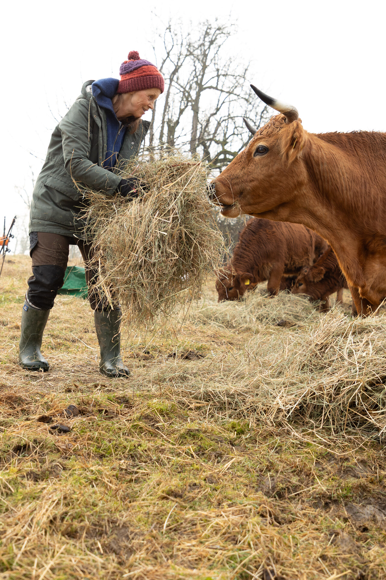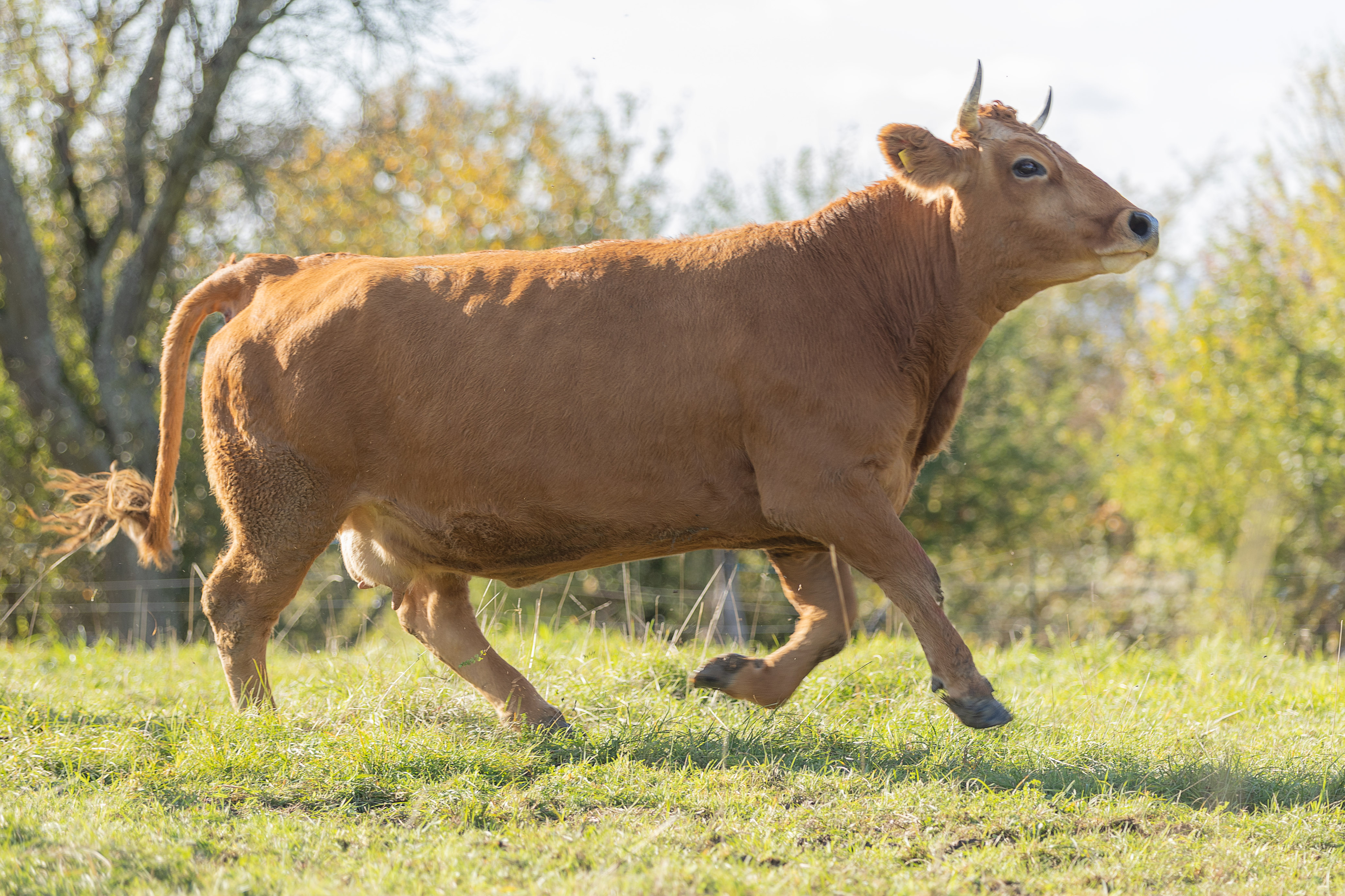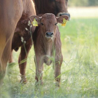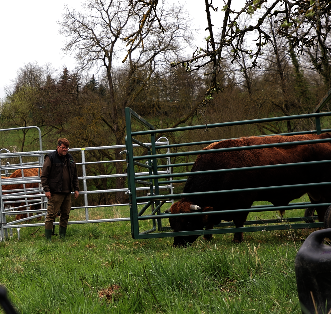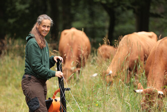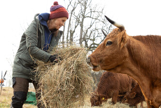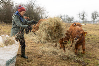 Die Rinderherde erhält ausschließlich Gras als Futter und wird im Winter mit Heu versorgt. Lediglich in der laktierenden Phase, wenn das Sommergras aufgrund von Trockenheit zu wenig Energie enthält, füttern wir zusätzlich Kraftfutter zu.