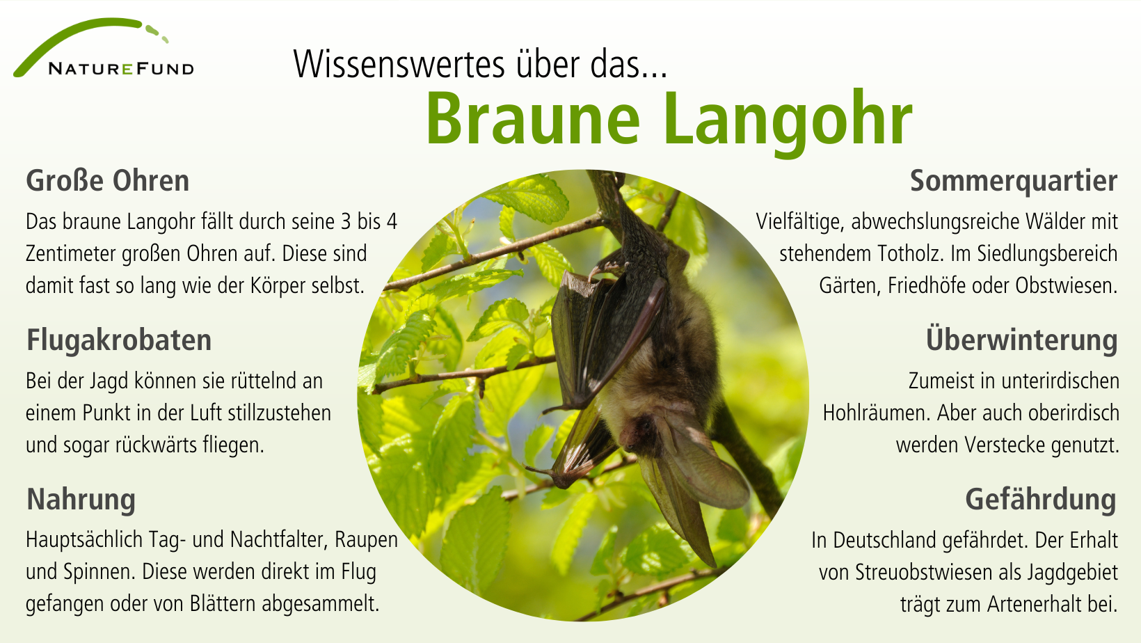 Die großen Ohren sind den Braunen Langohren insbesondere während ihrer nächtlichen Beutezüge behilflich. Denn mit diesen können sie während des Fluges noch die leisesten Echos ihrer Ultraschallrufe sowie raschelnde Geräusche ihrer Beute wahrnehmen. Die wendigen Jäger erbeuten vor allem Falter, Raupen und Spinnen, die sie dank ihres guten Gehörs direkt von Blättern, Baumstämmen oder dem Boden aufsammeln. Dabei kommt ihnen auch zugute, dass sie Beute im Rüttelflug ergreifen können. Heißt: Die Fledermäuse können während der Jagd rüttelnd an einem Punkt in der Luft still stehen und ihre Beute ergreifen. Zwar bewohnen die Langohrfledermäuse während des Sommers überwiegend Baumhöhlen in Wäldern, doch naturnah gestaltete Gärten, Streuobstwiesen sowie Grünflächen mit Obstbäumen und einer Vielzahl blühender Stauden sorgen für ein vielfältiges Insektenangebot, von dem die Fledermäuse bei der Jagd profitieren.