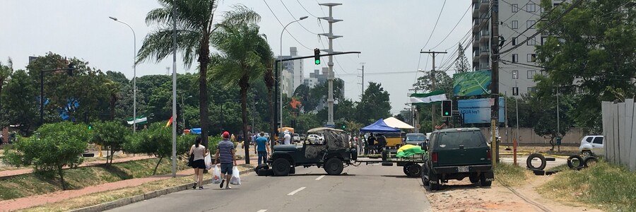 Die Bilder, die wir abends in der Tageschau sehen, ich bin nun mittendrin. Die Fahrt vom Flughafen zum Hotel war ein Abenteuer: Erst Taxi, dann Bloqueo = Straßensperre, weiter zu Fuß, dann auf einem zerschlissenen Motorrad, mein Koffer vorne, dann der Fahrer, dann ich. Immer wieder absteigen, Straßensperren umgehen, kleine Wege fahren, Leute fragen, wo der Weg noch frei ist, weiter. Das alles bei 35 Grad im Schatten. Wir kamen dann zum Hotel, schließlich abends, 20.00 Uhr und 30 Grad warm, meine Haut taut auf und meine Seele auch ein wenig. Ab und zu ertönen Schüsse von weit her. Erst hatte ich Angst, doch die Menschen bei den Straßensperren zünden Feuerwerke, sie bewachen auch nachts ihre Bloqueos.
