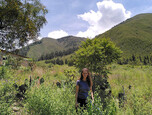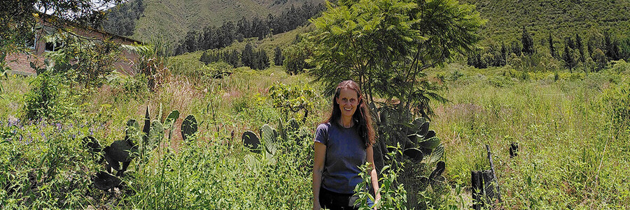 Montag fuhren wir nach Sacaba und besuchten zuerst Sonia. Sonias DAF-Parzelle ist vier Jahre alt und etwa 3000 m² groß. 100 Obstbäume und etwa eben soviele „Forestales“, also lokale, native Baumarten wurden hier gepflanzt. Wir gehen durch die Reihen und sehen Apfel- und Aprikosenbäumen neben Molle, Sauco, Aliso, Kewina und viele andere native Baumarten. Einige davon sind von Aussterben bedroht, wie Kewina zum Beispiel, eine Baumart, die nur hier an den Berghängen des Tunari Nationalparks vorkommt. In Sonias Baumreihen steht immer ein Obstbaum und nur 75 cm! weiter eine native Baumart, dann wieder ein Obstbaum. Die Forestales sind sogenannte Begleitbäume. Sie wurden gepflanzt, um die Obstbäume zu unterstützen. Sie bieten Schutz vor Wind, etwas Schatten vor zu starker Sonneneinstrahlung und über ihre Wurzeln fördern sie viele Mikroorganismen im Boden, die auch den Obstbäumen zugutekommen. Aber vor allem werden sie zur Produktion von Biomasse genutzt. Regelmäßig werden die Forestales geschnitten und mit ihren Ästen und Blättern der Boden bedeckt. Der Boden ist mit einer Schicht aus Biomasse bedeckt, auch Mulch genannt. Darunter ist es feucht und kühl, ideal für Kleinstlebewesen. Hier geht's zum Video-Interview mit Sonia.