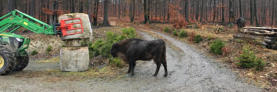 Freilebendes Wisent vor Heuballen