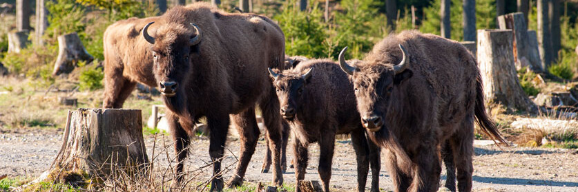 So schwer wie ein Kleinwagen und bis zu 2 Meter hoch ist der Wisent auch im dichten Wald kaum zu übersehen. Daneben verfügen sie über eine Kopf-Rumpf-Länge von bis zu 3 Metern. Wisente zählen damit zu den größten Landsäugetieren Europas.