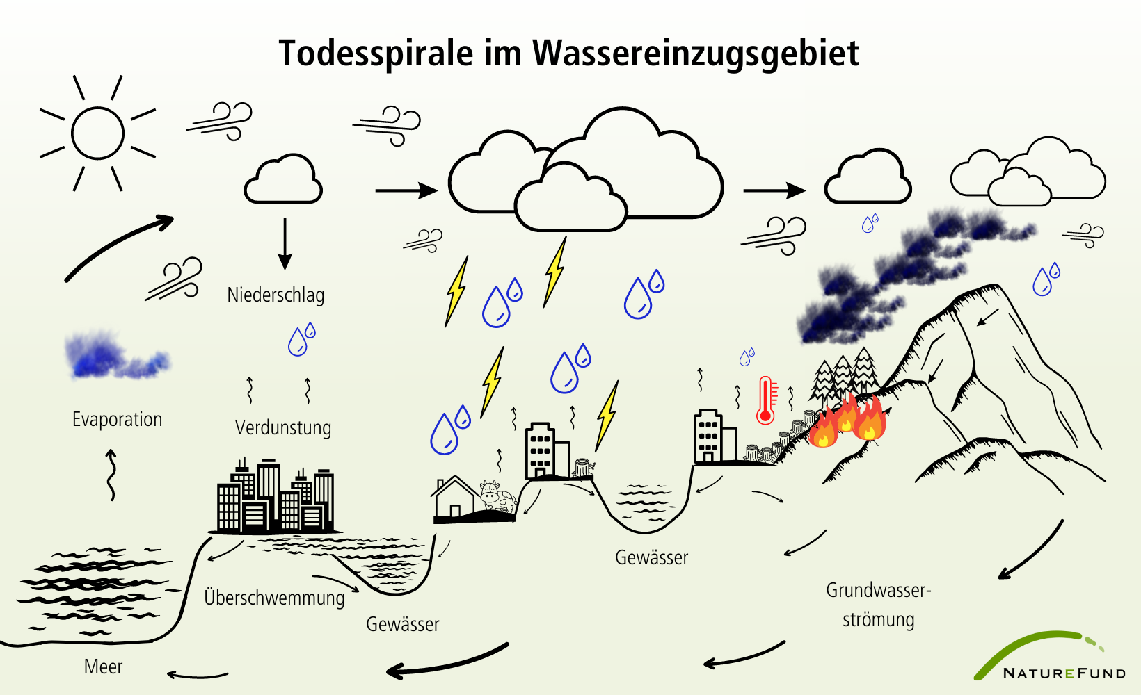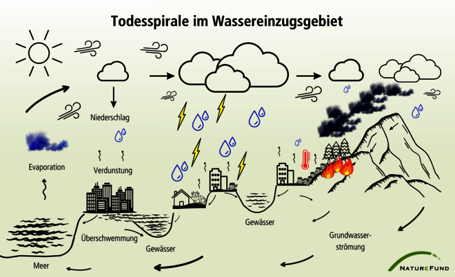 Anders sieht der Wasserkreislauf allerdings in unserer immer dichter besiedelten und versiegelten Landschaft mit stark abnehmenden Naturflächen und stetig wachsenden landwirtschaftlichen Anbauflächen aus. Ein wärmeres Klima, absterbende Wälder und austrocknende Bachläufe sind die Folge. Laut Wissenschaft wird prognostiziert, dass die derzeitige Wassernutzung in Kombination mit dem Klimawandel und der veränderten Landnutzung für Milliarden Menschen weltweit sowie unzähligen Naturräumen eine Wasserkrise hervorrufen könnte.