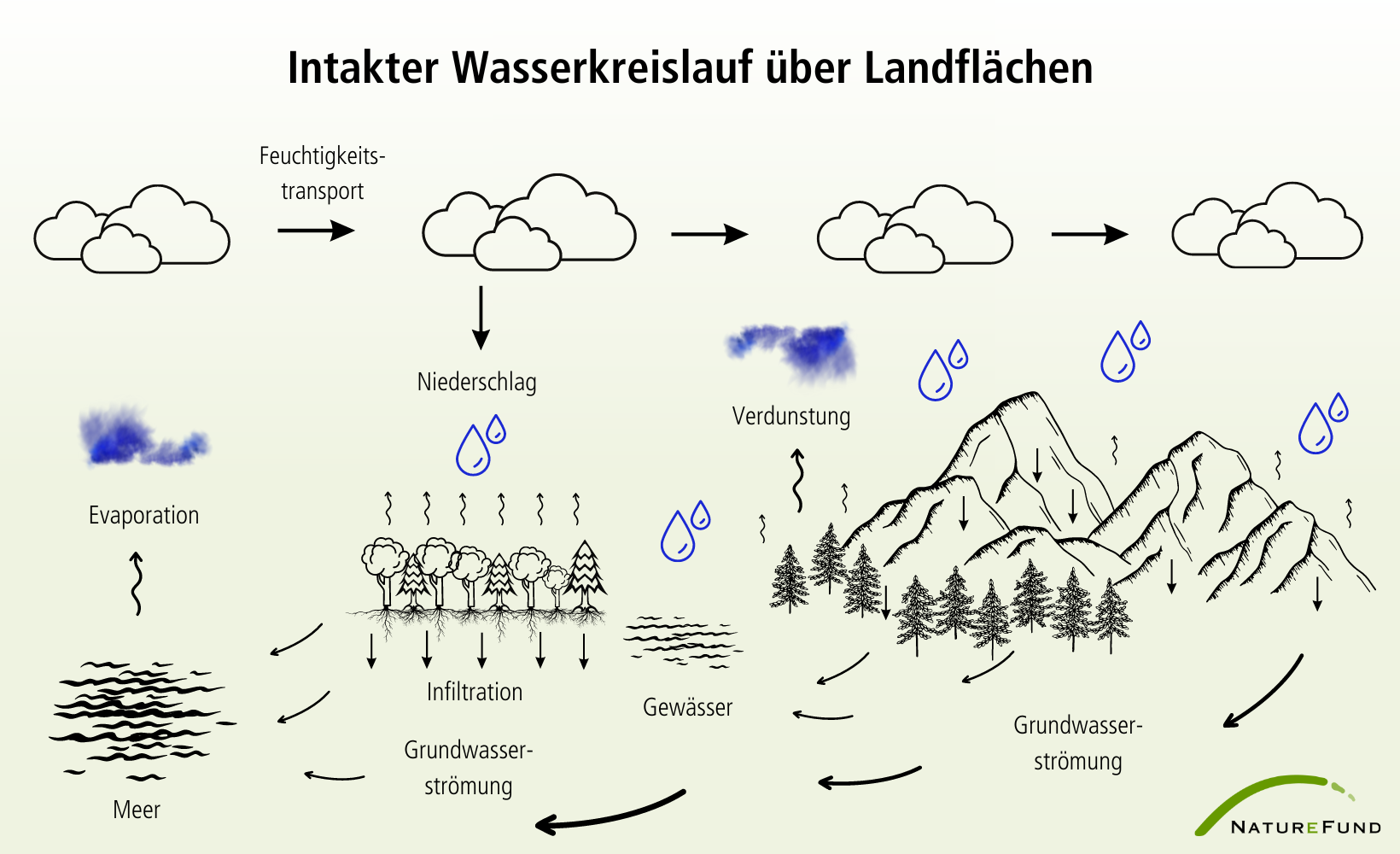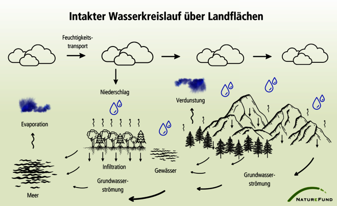 Der Wald und der Wasserkreislauf stehen in einer engen Wechselbeziehung. So bestimmt die Menge des jährlichen Niederschlages, ob Wald wachsen und sich gesund erhalten kann. Zeitgleich hat der Wald als Landschaftsform einen erheblichen Einfluss darauf, wo und wie viel Niederschlag fällt und aufgenommen wird.