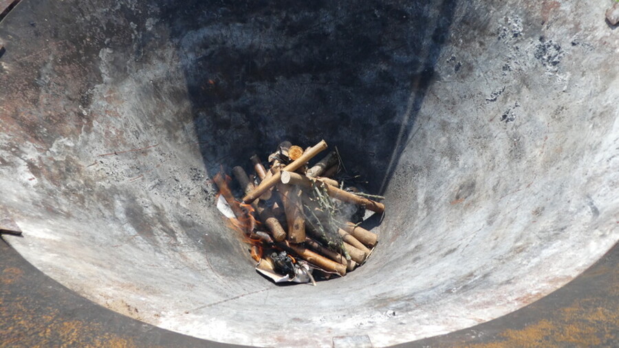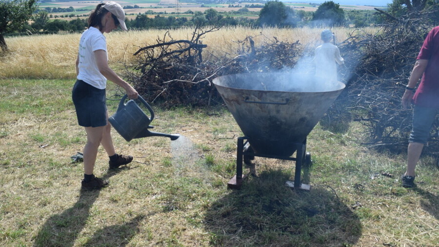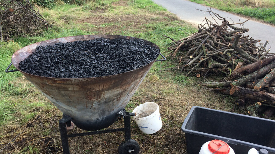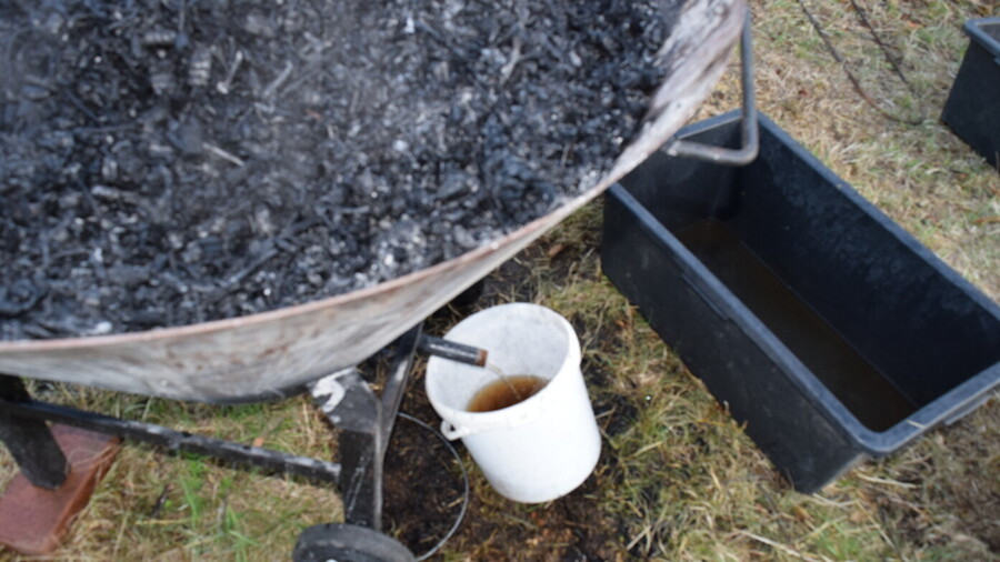 Wenn die gesamte Biomasse verbrannt ist, kann das Feuer mit reichlich Wasser abgelöscht werden. Sehr hilfreich ist hierbei der Gebrauch von Gießkannen oder Eimern. Der Vorgang des Feuerlöschens ist sehr wichtig, da ansonsten keine Kohle, sondern unbrauchbare Asche hergestellt wird.